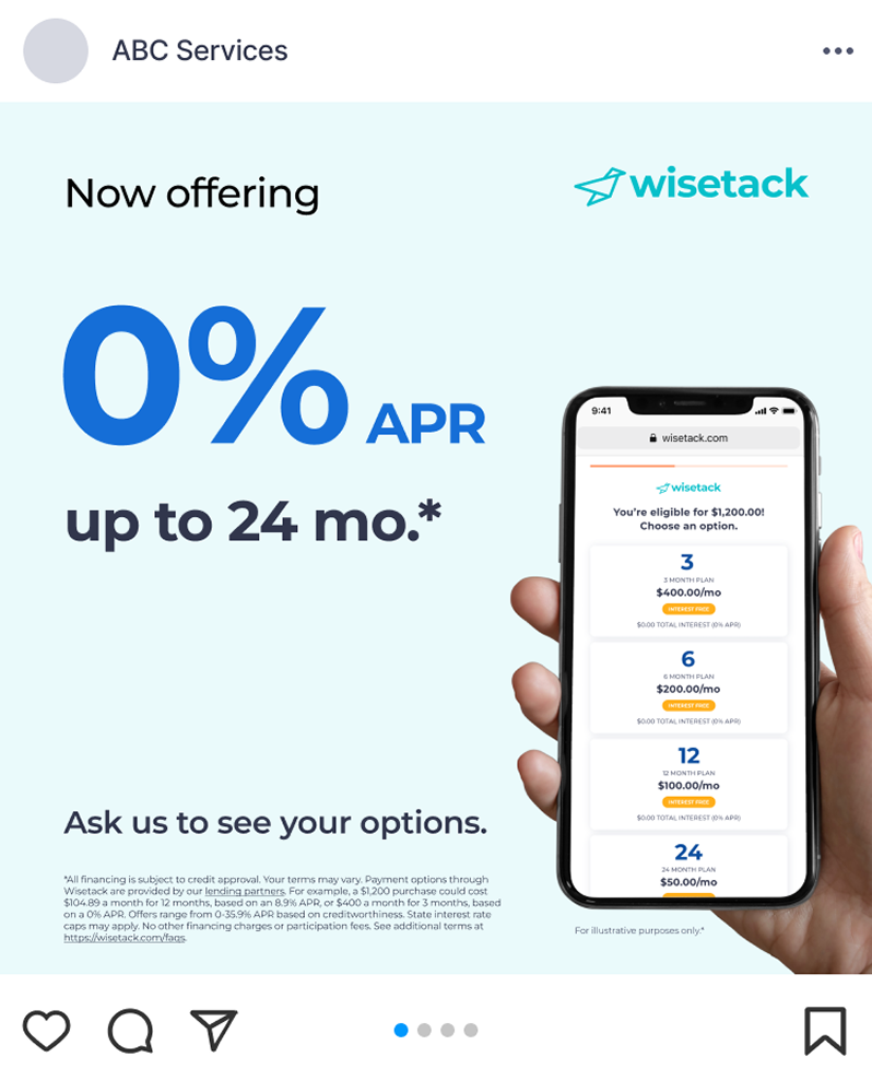 <div class="section-code-example"><div class="container-code-example"><div class="content-code-example-1"><div class="box-code-example"><div class="margin-bot-24-code-example"><h2 class="title-code-example">We offer financing</h2></div><div class="margin-bot-24-code-example"><p class="paragraph-code-example-lg">We’ve partnered with <a href="https://www.wisetack.com/" target="_blank" class="link-blue">Wisetack</a> We’ve partnered with Wisetack to offer our customers flexible financing options, so you can pay over time rather than all at once. The application takes about a minute to complete, and checking your options does not impact your credit score.</p></div><div class="margin-bot-24-code-example"><ul role="list" class="list-code-example"><li class="list-item-code-example">Finance projects up to $25,000*</li><li class="list-item-code-example">Loan options from 3 to 120 months*</li><li class="list-item-code-example">APRs range from 0 to 35.9%*</li><li class="list-item-code-example">No hidden fees or compounding interest</li></ul></div><div class="margin-bot-24-code-example"><div class="banner-code-example"><p class="paragraph-code-example-lg text-weight-semibold">0% APR available up to {{INSERT SPECIFIC PLAN LENGTH}} months* for eligible customers</p></div></div><div class="margin-bot-24-code-example"><p class="paragraph-code-example-lg"><a href="#" class="link-blue">Prequalify today</a> with no impact to your credit and contact us to learn about financing your next project!</p></div><div class="margin-bot-24-code-example"><a href="#" class="btn-code-example w-button">PREQUALIFY NOW</a></div><p class="paragraph-code-example">*All financing is subject to credit approval. Your terms may vary. Payment options through Wisetack are provided by our <a href="https://www.wisetack.com/lenders" target="_blank" class="link-green">lending partners</a>. For example, a $1,200 purchase could cost $104.89 a month for 12 months, based on an 8.9% APR, or $400 a month for 3 months, based on a 0% APR. Offers range from 0-35.9% APR based on creditworthiness. State interest rate caps may apply. No other financing charges or participation fees. See additional terms at <a href="https://www.wisetack.com/faqs" target="_blank" class="link-green">https://www.wisetack.com/faqs</a>.</p></div><img src="https://cdn.prod.website-files.com/5f194315e6b47c1697925302/669ba19f4113ec5bb7fe149b_phone-mockup.png" loading="lazy" width="404" sizes="(max-width: 479px) 93vw, (max-width: 767px) 53vw, 35vw" alt="" srcset="https://cdn.prod.website-files.com/5f194315e6b47c1697925302/669ba19f4113ec5bb7fe149b_phone-mockup-p-500.png 500w, https://cdn.prod.website-files.com/5f194315e6b47c1697925302/669ba19f4113ec5bb7fe149b_phone-mockup-p-800.png 800w, https://cdn.prod.website-files.com/5f194315e6b47c1697925302/669ba19f4113ec5bb7fe149b_phone-mockup.png 808w" class="iphone-img-code-example"></div></div></div>