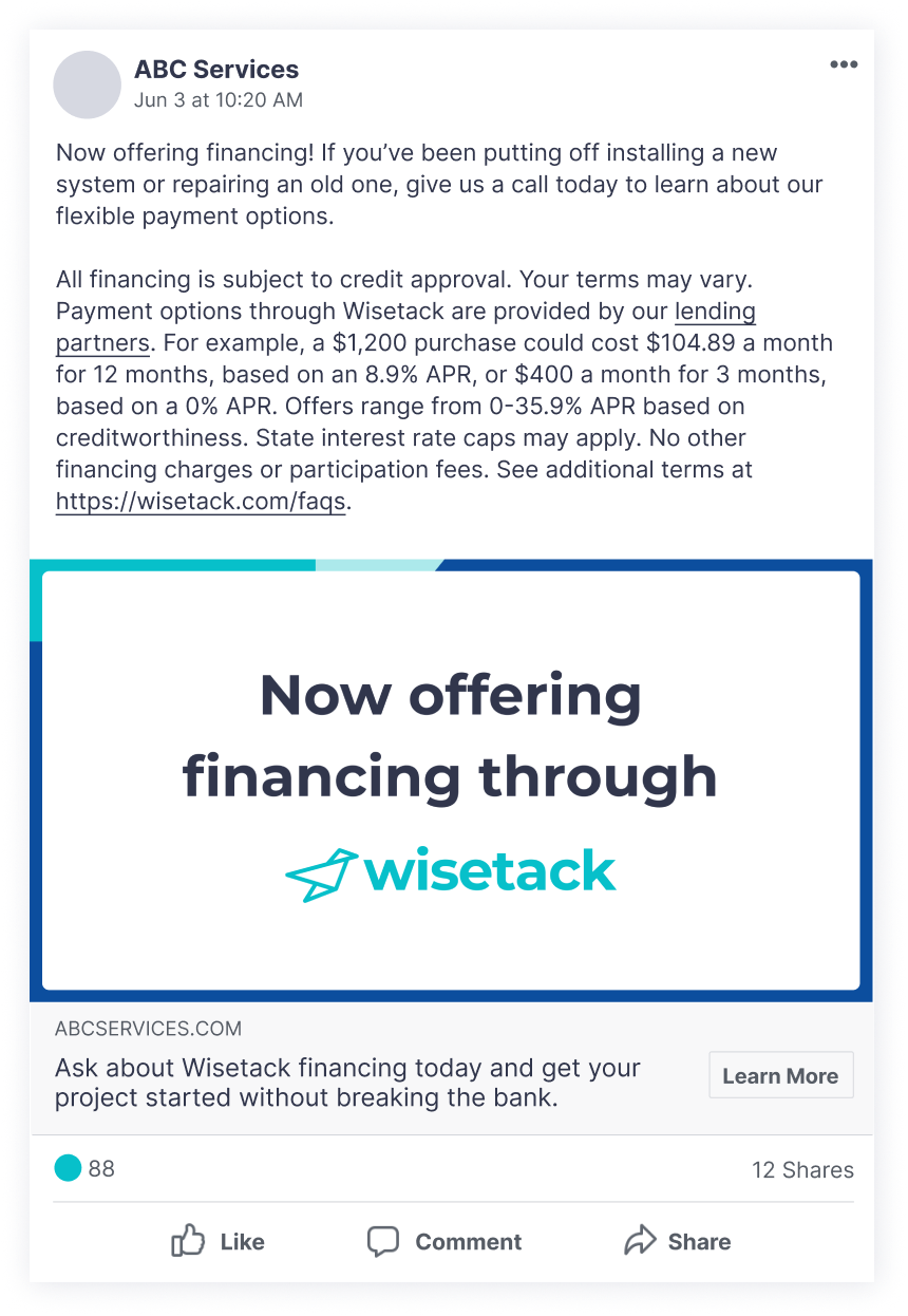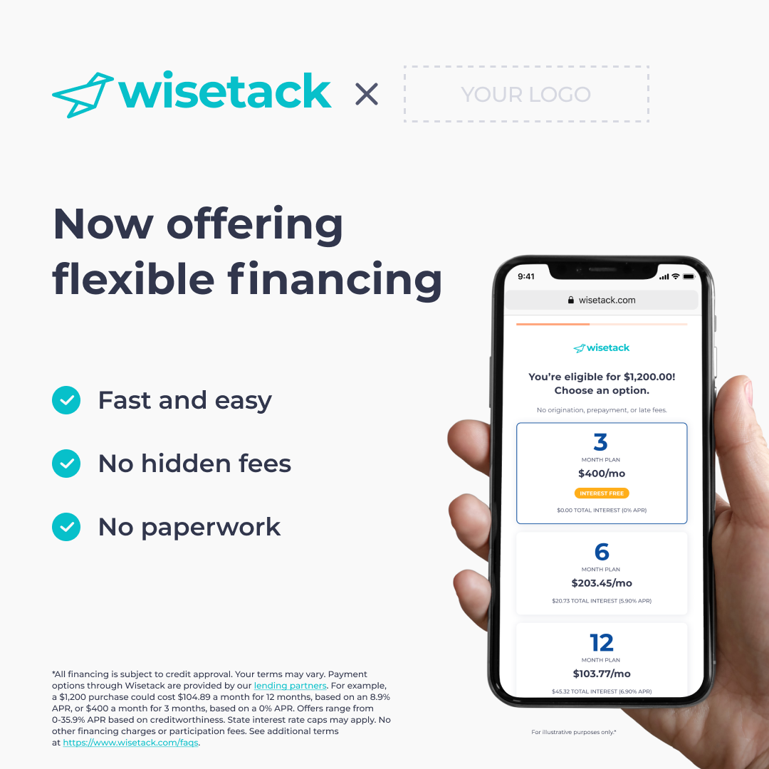 Communicating your partnership with Wisetack through social channels is a great way to bring awareness to the benefits of using Wisetack’s payment options. To create and customize your own social media posts, head to our